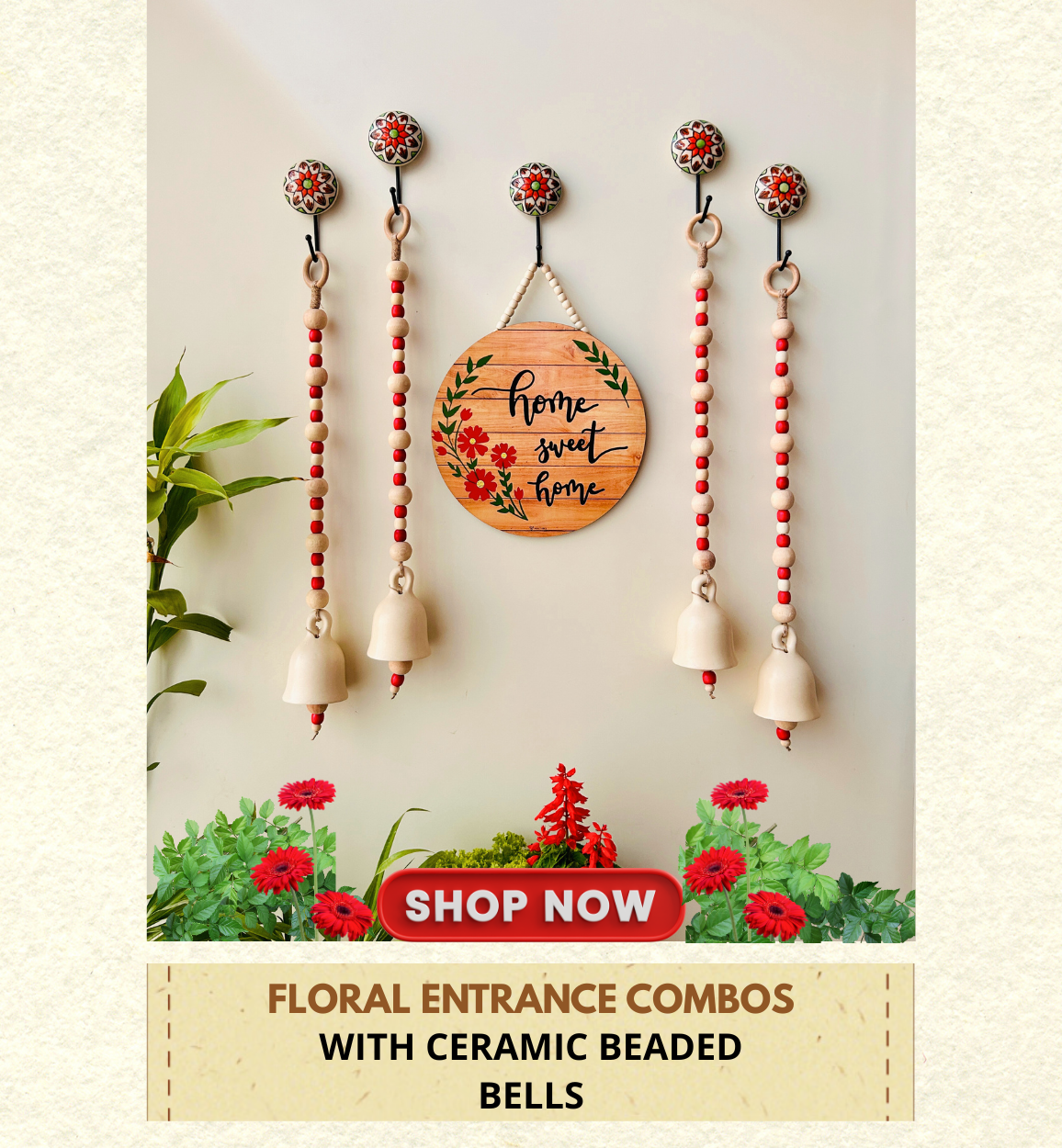 Boho Floral Entrance Wall Set – Handmade & Heartfelt | 4 Ceramic Ivory white bells with a wooden welcome sign board | Ceramic hooks |Serene and Calming Decor option