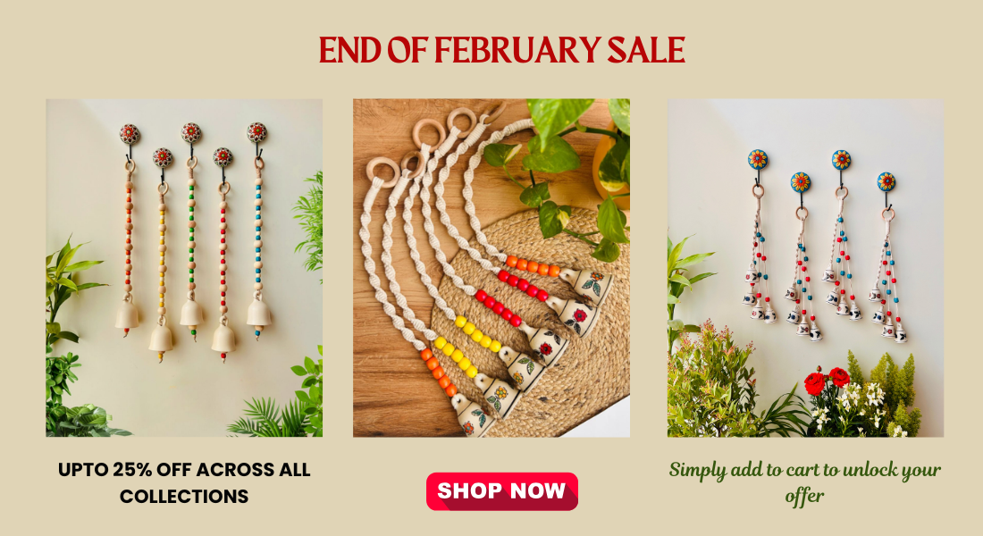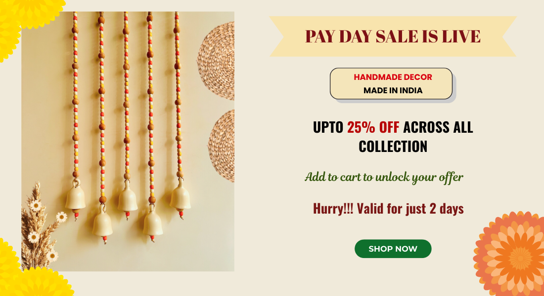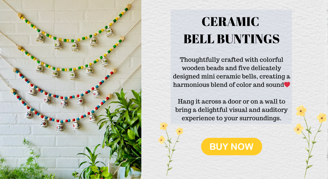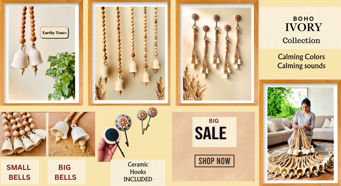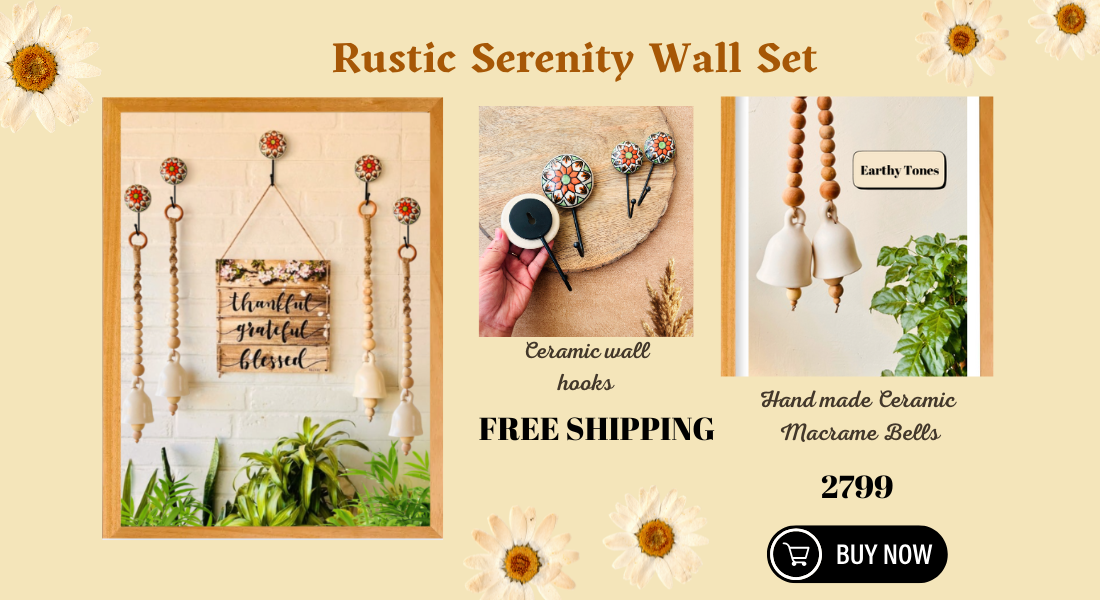 Handcrafted Wall Decor Combo – Ceramic Bells & Wooden Wall Hanging Create a warm, welcoming corner in your home with this thoughtfully curated handmade wall décor set, designed to blend...