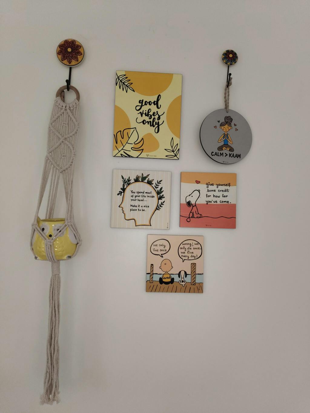• Wooden hangings/stick-ons - These come either with double sided adhesive to stick or a rope to hang on a nail/hook.